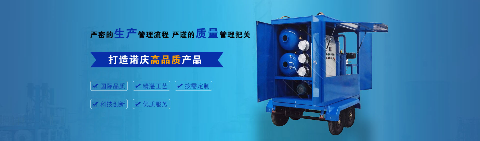 公司通過ISO9001-2015質(zhì)量管理體系認(rèn)證,CE歐盟認(rèn)證,諾慶公司所有濾油機(jī)配套產(chǎn)品均采用國內(nèi)外知名品牌,經(jīng)過多年的使用,具有質(zhì)量可靠,性能優(yōu)良。公司擁有完備的檢測(cè)儀器和檢測(cè)設(shè)備,所有產(chǎn)品出廠前經(jīng)過嚴(yán)格測(cè)試,保證每一臺(tái)產(chǎn)品合格出廠。